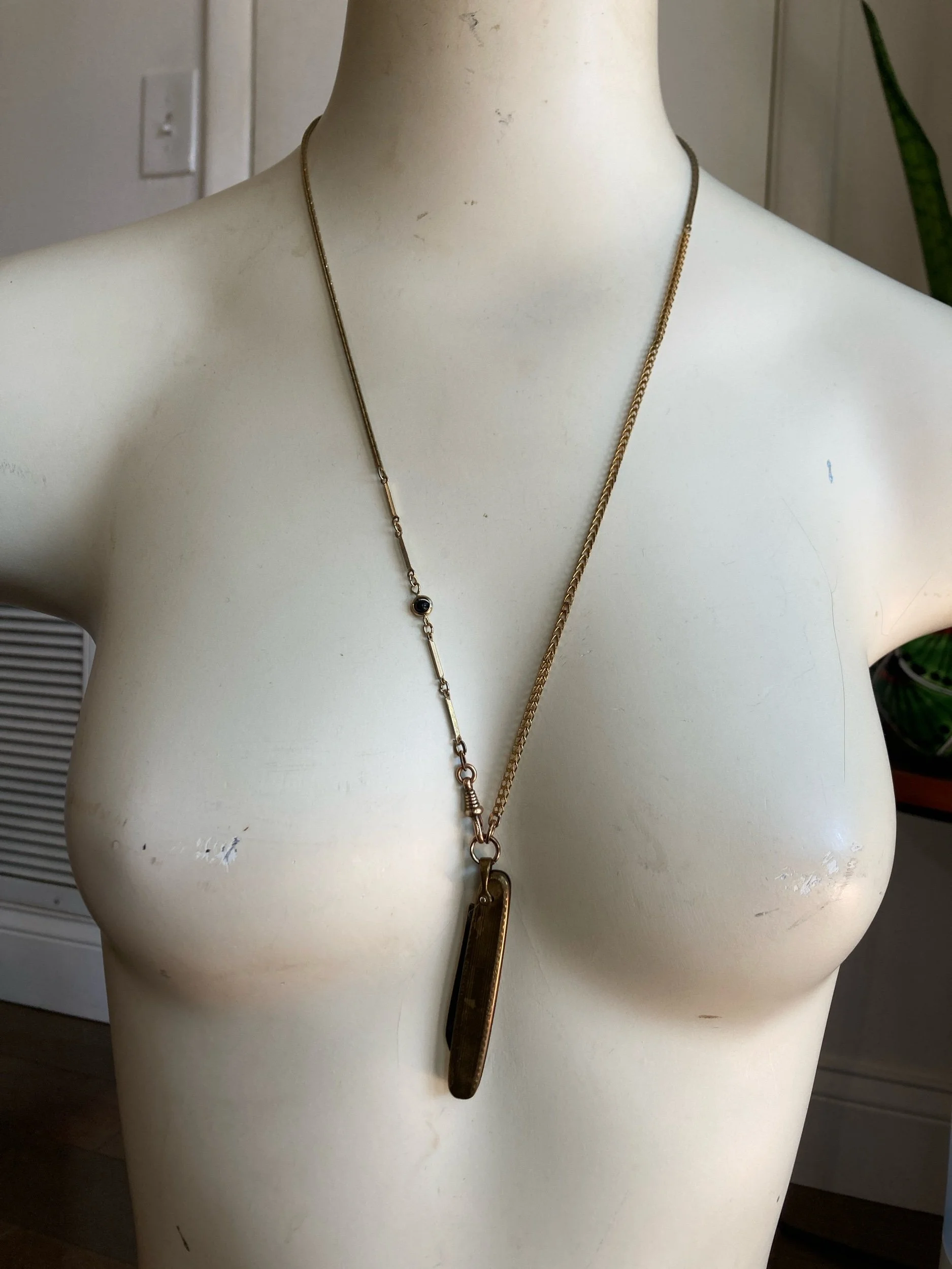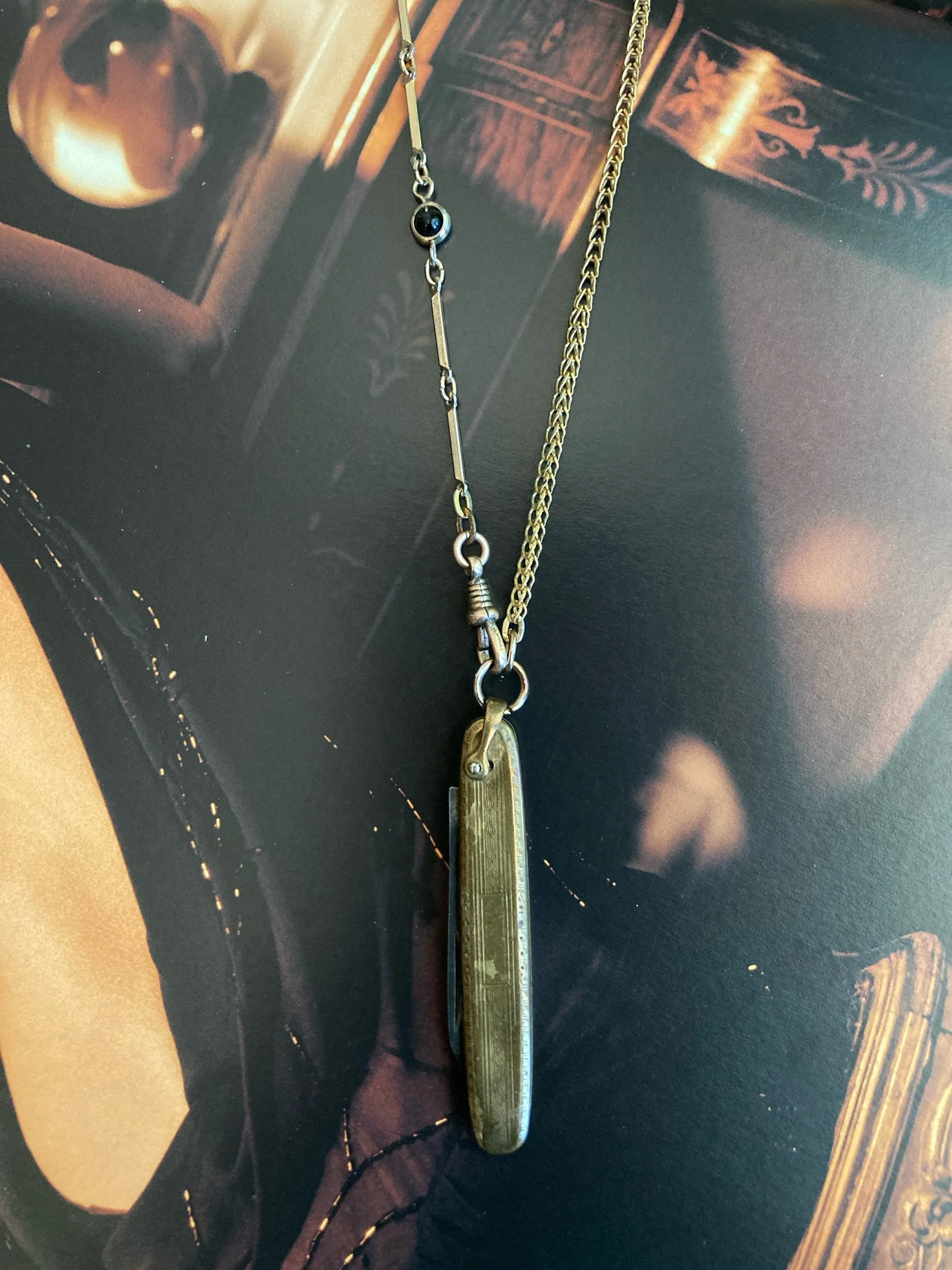 Vintage pocketknife paired with mixed vintage chains and watch fob clip. Chain is approximately 26" (66cm) long. Pocketknife measures approximately 2.5" (6.35cm) long.